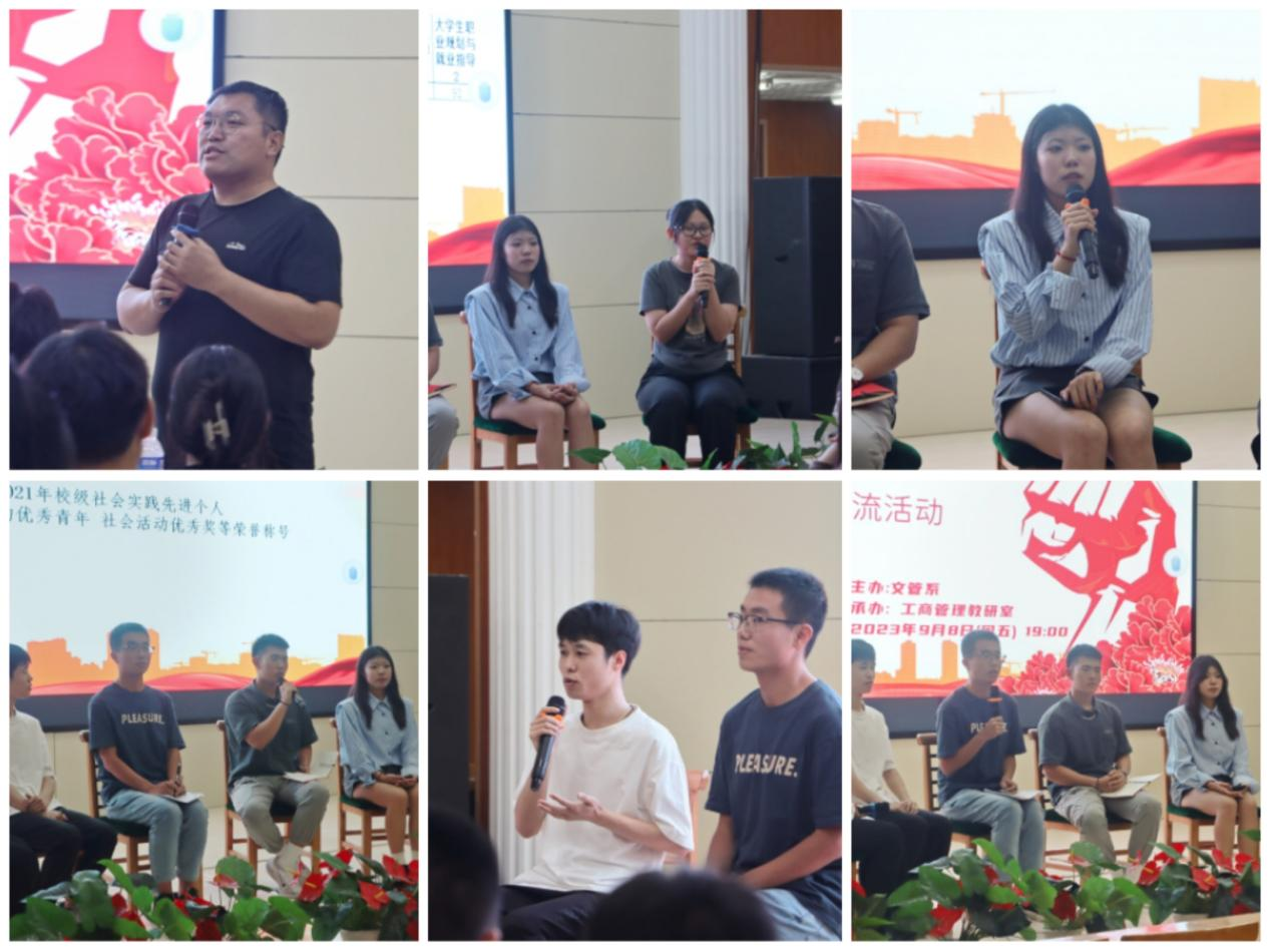 新学期、新气象,为了同学们在新学期更好地树立新学期目标,做好新学期学习规划,2023年9月8日晚上7:00,在渤海校区求实讲堂以“榜样的力量”为主题开展新学期共话成长访谈交流活动。此次活动由工商管理教研室李国栋老师负责组织开展,邀请工商管理2001班安晓明、物流管理2005班代鹏宇、工商管理2001班王梓逸、工商管理2102班邱心怡、会计2202班谢雨菡五位优秀学生代表作为访谈嘉宾,以榜样的力量与同学们进行分享与讨论。