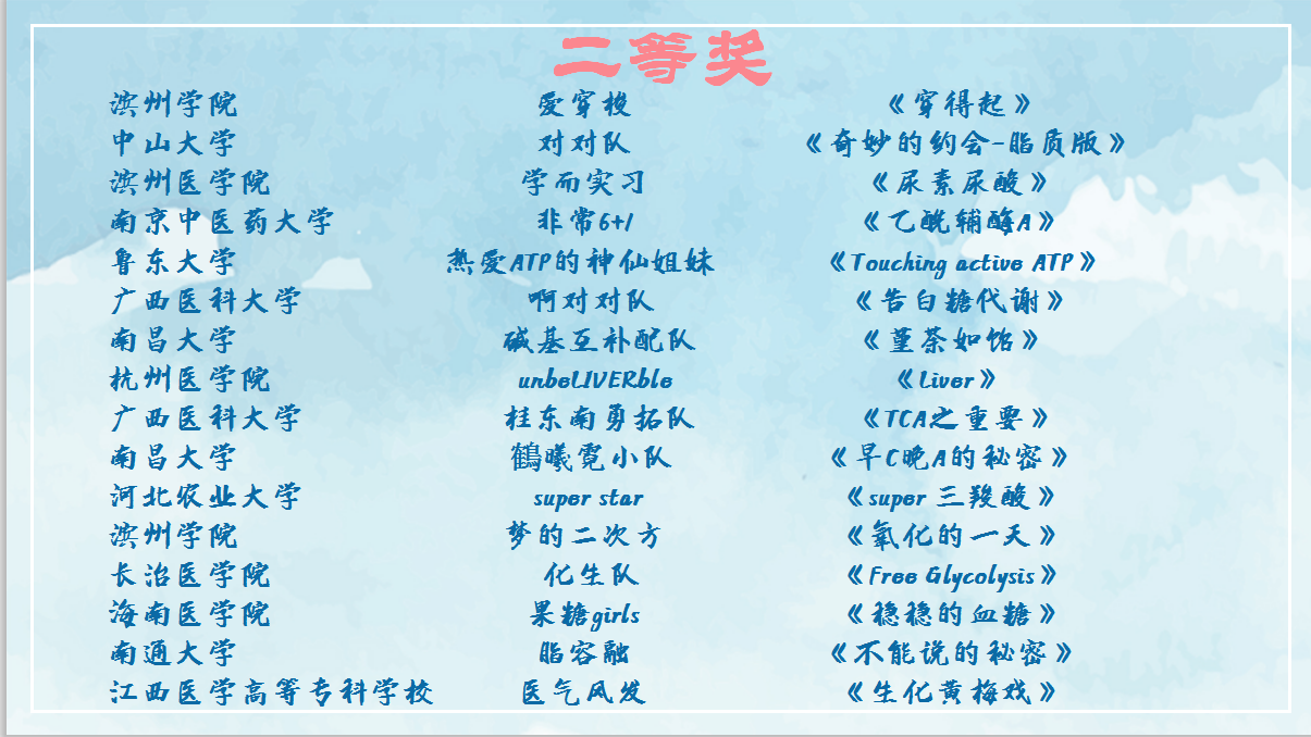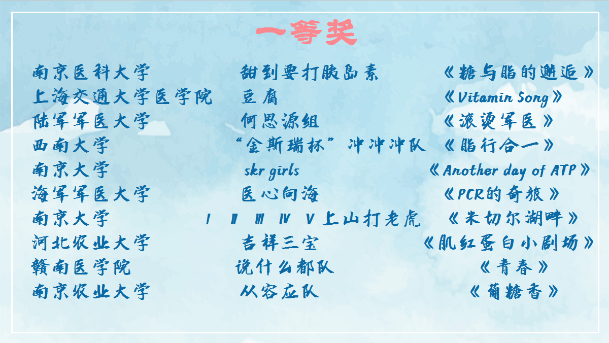 第五届“金斯瑞杯”全国大学生生物化学歌曲大赛由中国生物化学与分子生物学学会教学专业委员会主办,南京大学和江苏省省生物化学与分子生物学学会承办。大赛以线上形式进行,共有来自上海交通大学、中山大学、南京大学等全国59所学校108首作品参赛。参赛作品覆盖了生化课程的全部内容,参赛队伍将生化知识与歌曲旋律巧妙结合,优美的曲调、清新的画面,巧妙融入生化知识的歌词,展示出生物化学的奇妙反应。