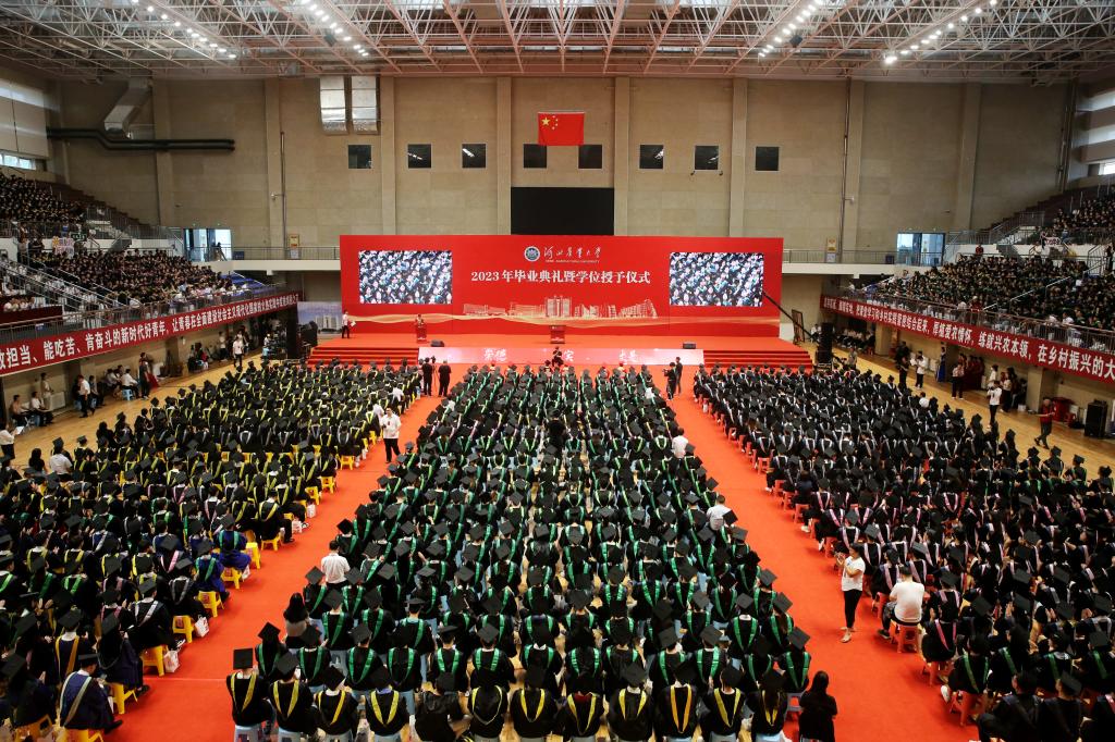 6月19日上午,18luck新利手机版iso2023年毕业典礼暨学位授予仪式在西校区体育馆隆重举行。毕业典礼通过网络全程视频直播,全体校领导、学位评定委员会委员,相关职能部门、二级学院负责人,教师代表、优秀校友代表、全体毕业生共12000余人“云”聚现场,共襄盛举。渤海学院、海洋学院设分会场,校党委副书记王英主持典礼。