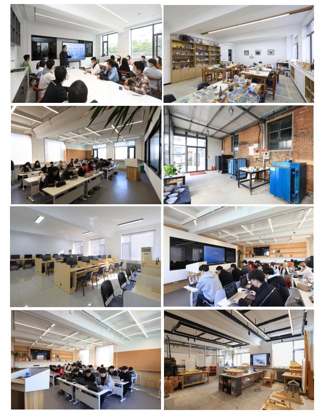 艺术创作教室28间、艺术设计微机实验室2个、图文实训实验室1个、模型工作室1个、虚拟现实验室1个、摄影实验室1个、陶艺雕塑实验室1个、纤维实验室1个、版画实验室1个、漆艺实验室1个、禾农工坊创新工作室1个、美术馆1个。