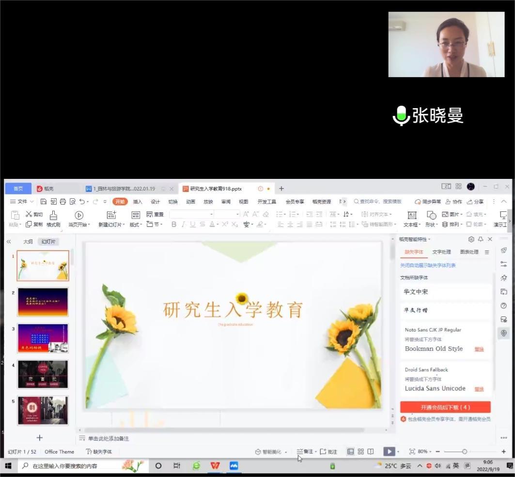 为了帮助22级研究生合理规划研究生学业生涯和职业发展,提早明确学习目标,尽快实现从本科生到研究生身份的转变,9月19日园林与旅游学院举办了研究生学业规划与职业发展教育线上讲座,学院副院长张晓曼主讲,研究生辅导员郭二秀主持,学院全体22级研究生新生参加。