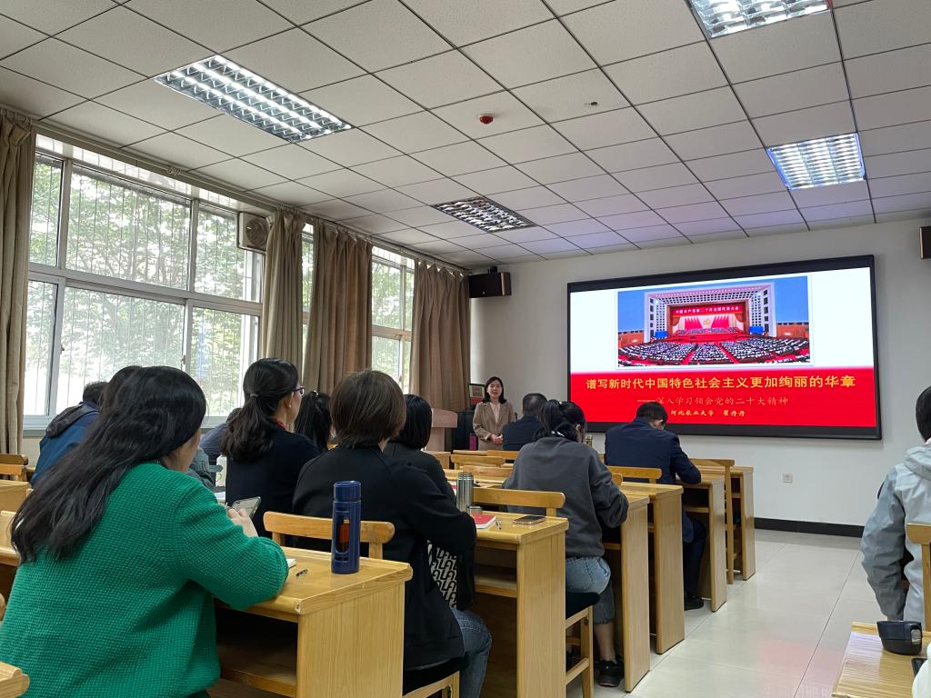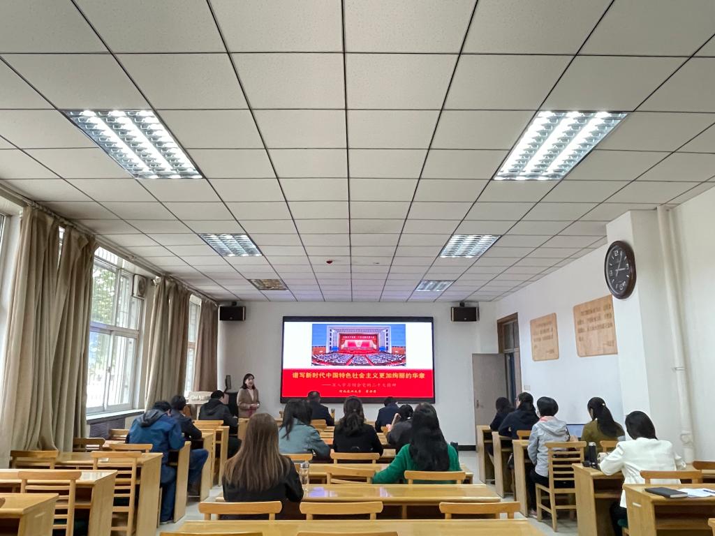 为深入学习贯彻党的二十大精神,扎实推进学习贯彻习近平新时代中国特色社会主义思想主题教育,4月20日学院举办党的二十大精神宣讲报告会暨学习贯彻习近平新时代中国特色社会主义思想主题教育动员部署会,会议由学院党委书记崔建会主持,马克思主义学院教师翟丹丹老师担任主讲,全体党员教师和党员学生代表60余人参加会议。
