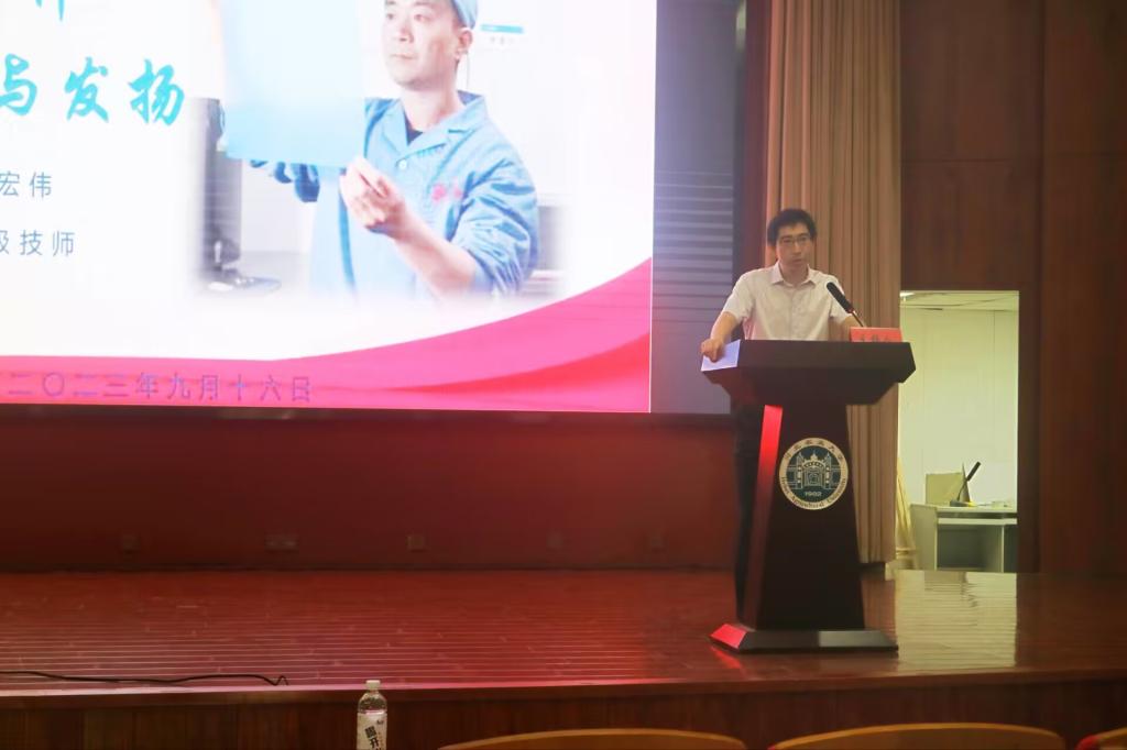 张宏伟以“充分发扬工匠精神,全面建成社会主义现代化强国”为题,结合自己在乐凯集团20多年来,从最初的学徒工成长为技术能手,从工艺研究到解锁攻克多项卡脖子技术,再到创造多项理论极限的技术大咖经历,诠释了从“工”到“匠”的蜕变;结合人物案例讲解了干一行、爱一行、专一行、精一行的敬业精神;最后,他鼓励青年学生要专注学习,努力提高自身素养和专业水平,要抓住精髓,勇于创新,追求卓越,奋勇争先,在自己的工作、学习、生活中大力弘扬劳模精神、劳动精神、工匠精神,牢记习近平总书记的嘱托,做一名无愧于党、无愧于国家、无愧于亲人和师长,无愧于青春梦想的青年大学生!