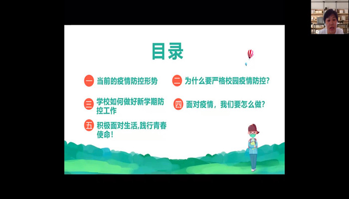 9月4日上午,园林与旅游学院在线上举办《开学防疫第一课》讲座,学院辅导员张丽芳主讲,2021级全体学生参加。
