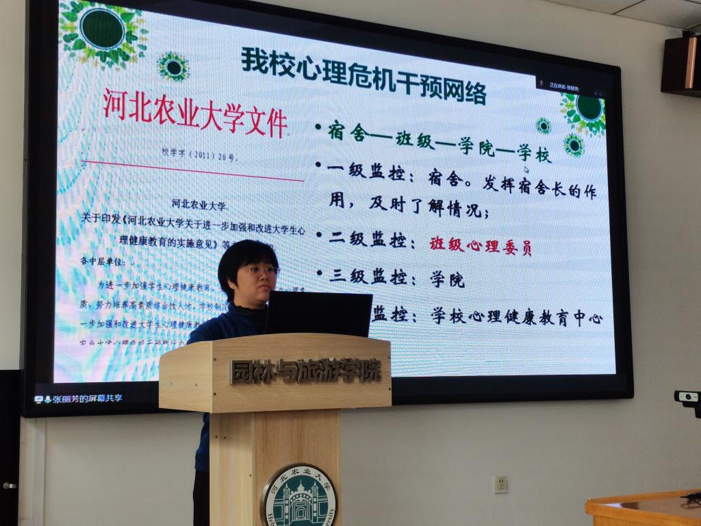 5月10日,园林与旅游学院通过线上线下相结合的方式举办心理健康教育讲座,学院学工办教师张丽芳主讲,各班心理委员在学院2126会议室参加线下讲座,其余班委和宿舍长在线上参加。