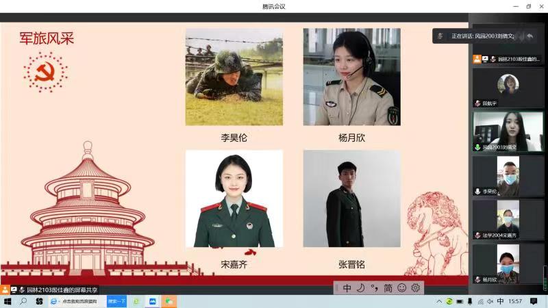 9月17日,学院以班为单位举办了爱国主义影片线上观影活动。同学们通过观看《我和我的祖国》《追光》《八佰》等爱国影片,坚定了理想信念和爱国主义情怀。9月19日,各班以线上会议的方式带领班级同学云游“蠡县梁斌黄胄纪念馆”,感受作家梁斌、画家黄胄的革命人生和艺术历程,在声、光、电的场景复原里,仿佛身处那个烽火燃烧的年代,同学们见证现代文艺界双子星的冉冉升起,感知一代文学巨匠和著名国画大师的人生艺术历程。9月22日,学院邀请我校优秀退伍老兵李昊伦、杨月欣、宋嘉齐、张晋铭四位同学分享部队的日子,他们分别从参军的初心,部队的生活以及个人成长三方面进行介绍,有老兵感叹:“当兵是我这辈子最骄傲的事!我能早早的与国家融为一体,每每想到此,我都无比高兴!”通过分享,同学们不仅感受到老兵在部队的生活,看到军人的使命与担当,而且了解到参军入伍的相关政策,激发了同学们的爱国热情和参军积极性。活动结束后,同学们纷纷写了自我感受并发表交流。有同学表示:“作为一名大学生,我们应该努力学习,奋发图强,为国家做出自己的贡献。”9月24日,各班开展国防教育主题班会。通过讲解伟人的事迹、观看国防宣传片等方式学习国防常识,增强学生国防意识,提高军事知识,了解军事基础,建立保家卫国思想,加强了解世界及中国军事动态,从而培养学生爱国主义精神,树立为中国的强大而努力奋斗的思想。