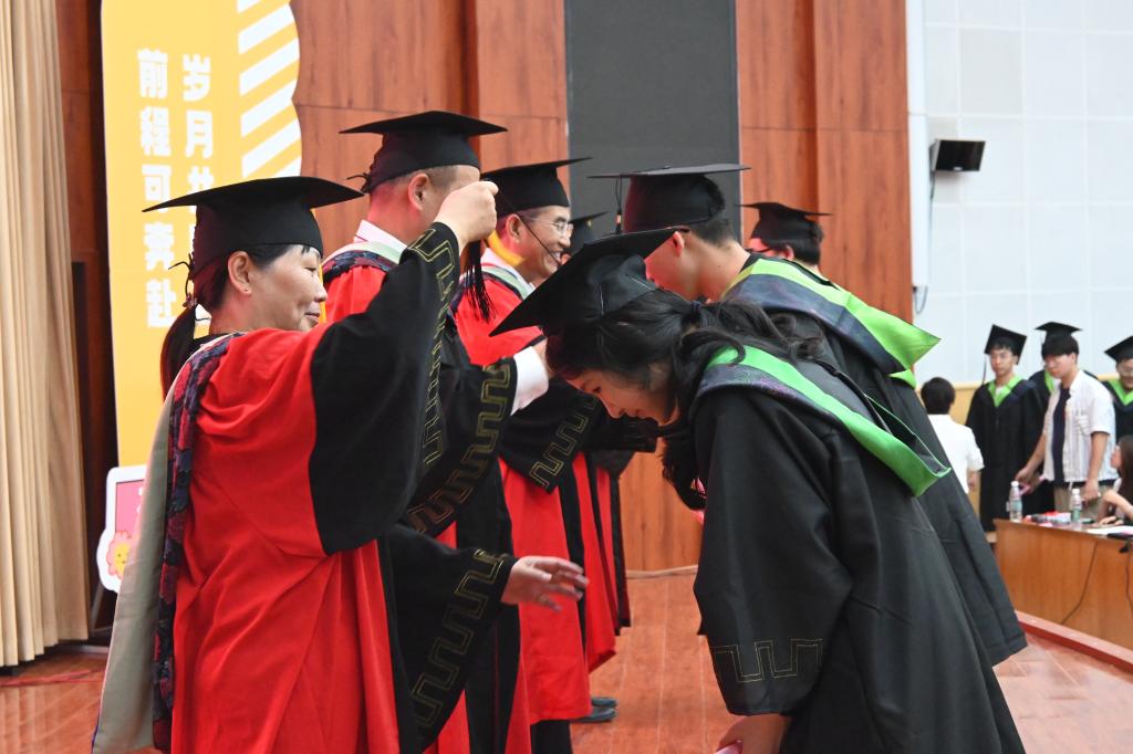 硕士毕业生代表张璐和本科毕业生代表旺莹在台上分享了自己在母校的点滴回忆,深情表达了对母校的不舍和感恩。在校生代表马天阔向毕业学子送上了真挚的祝福,愿他们前程似锦,未来可期。教师代表杨会娟则对毕业生们提出了殷切的期望,希望他们不忘初心,脚踏实地,用汗水和智慧书写自己的人生篇章。学院院长黄印冉代表全体师生对2024届毕业生送上祝愿和殷切期望,勉励同学们心怀家国,勇担使命,做时代的弄潮儿;不忘来路,坚定理想,胸怀远大志向;面对困难坚韧不拔,热爱生活,用才华和努力点亮出彩人生。随后,学院教授委员会委员逐一为2024届毕业生拨穗正冠。