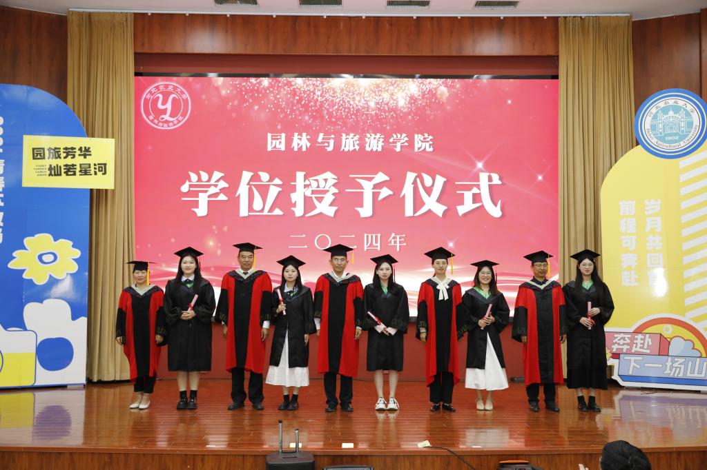 青衿之志,履践致远。6月2日,园林与旅游学院2024届毕业典礼暨学位授予仪式在西校区图书馆报告厅隆重举行。学院领导、各专任教师、行政人员和全体本科生、研究生毕业生及部分家长代表近400人参加典礼仪式。学院党委副书记时君伟主持典礼仪式。