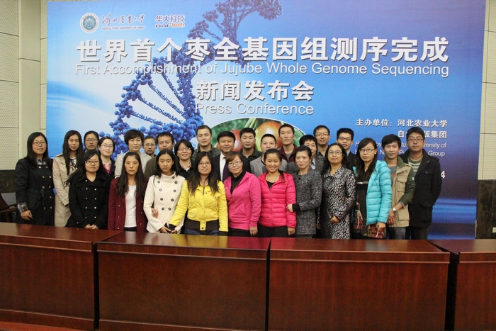 刘孟军教授在“世界首个枣全基因组测序完成新闻发布会”上介绍成果情况
