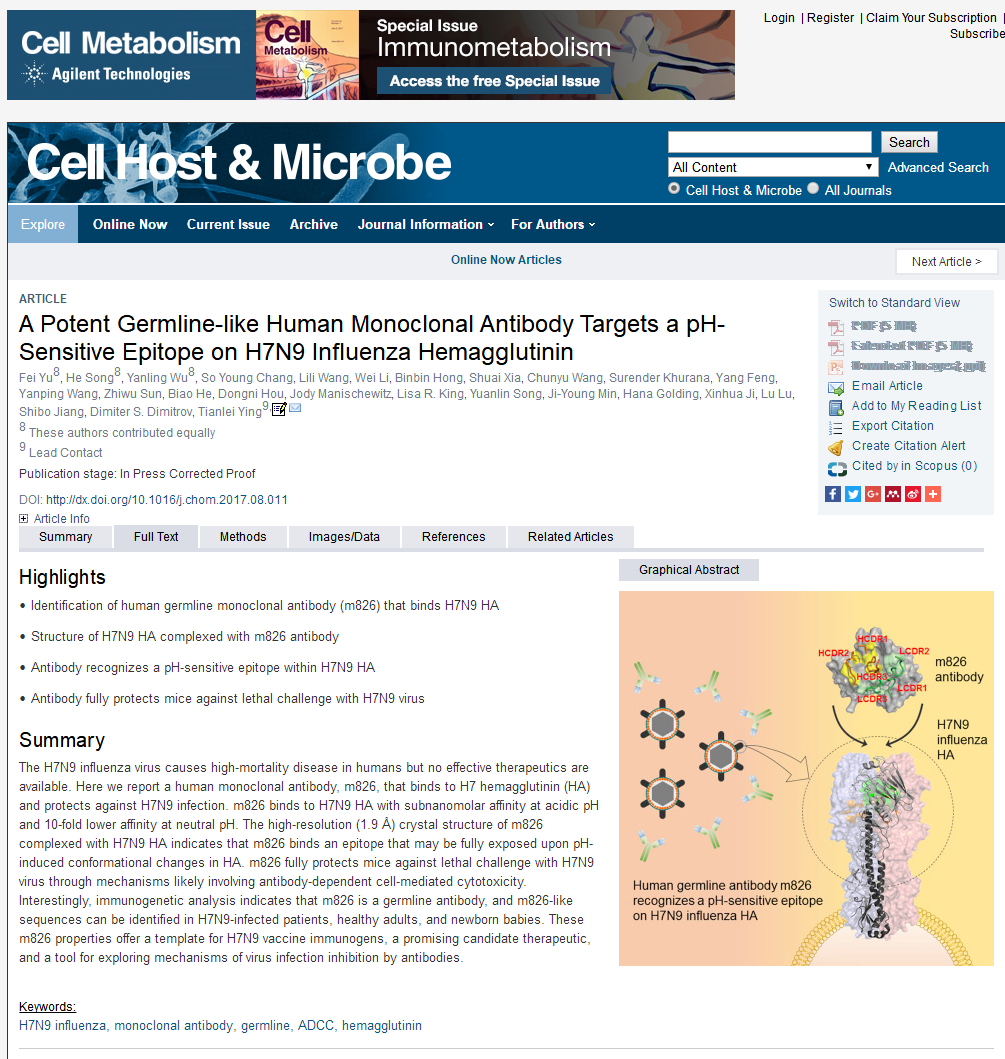 近日,我院于飞副教授相关研究成果“A Potent Germline-like Human Monoclonal Antibody Targets a pH-Sensitive Epitope on H7N9 Influenza Hemagglutinin”于2017年9月28日在线发表在国际顶尖期刊cell子刊cell Host & Microbe上(中科院JCR分区为1区TOP期刊,IF=14.946)。于飞副教授为共同第一作者(排名第一),复旦大学基础医学院应天雷研究员为通讯作者。