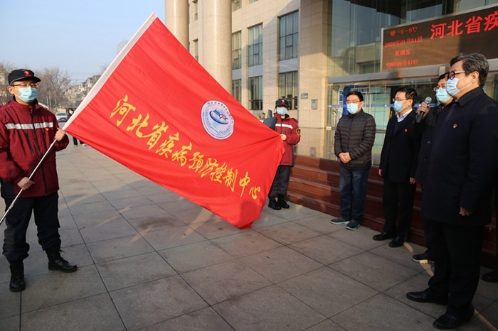 第一批支援湖北应急检测队出征仪式,贾肇一接受出征授旗