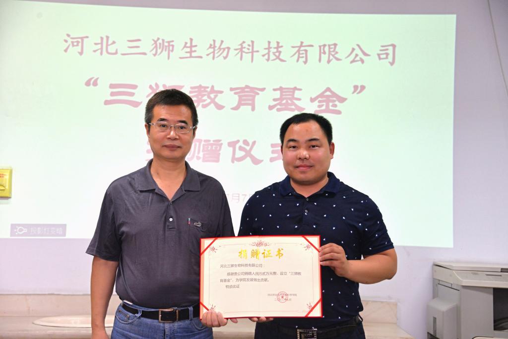 7月7日上午,由河北三狮生物科技有限公司筹建的“三狮教育基金”捐赠仪式在生命科学学院举行。学院2012届毕业生、现任河北三狮生物科技有限公司总经理时凡重返母校,每年出资2万元以上设立“三狮教育基金”支持学院人才培养。学院领导班子和全体行政人员参加了捐赠仪式。