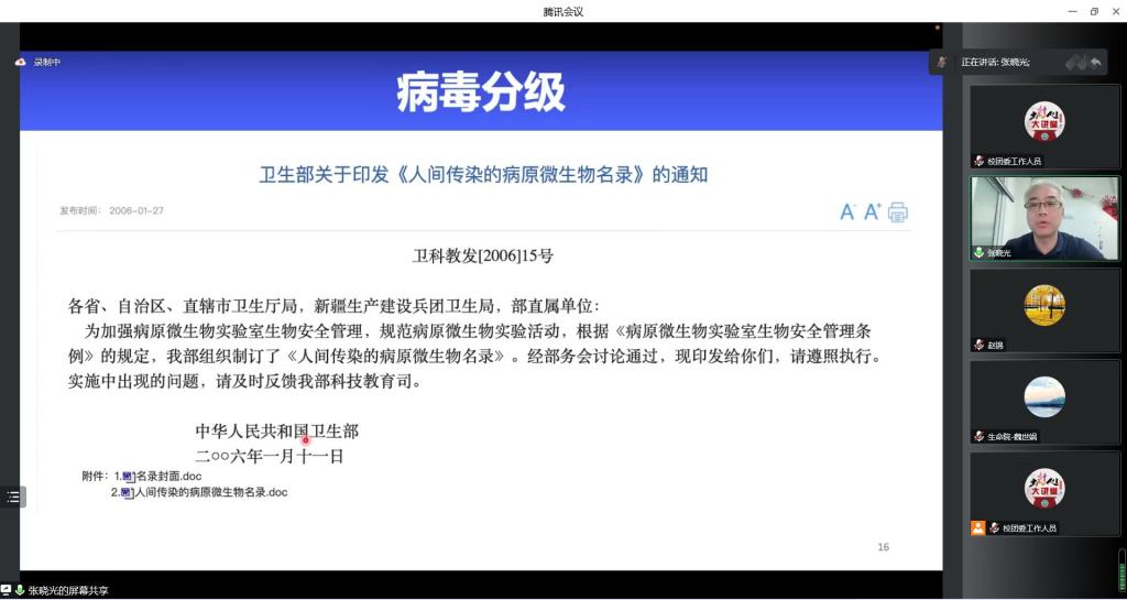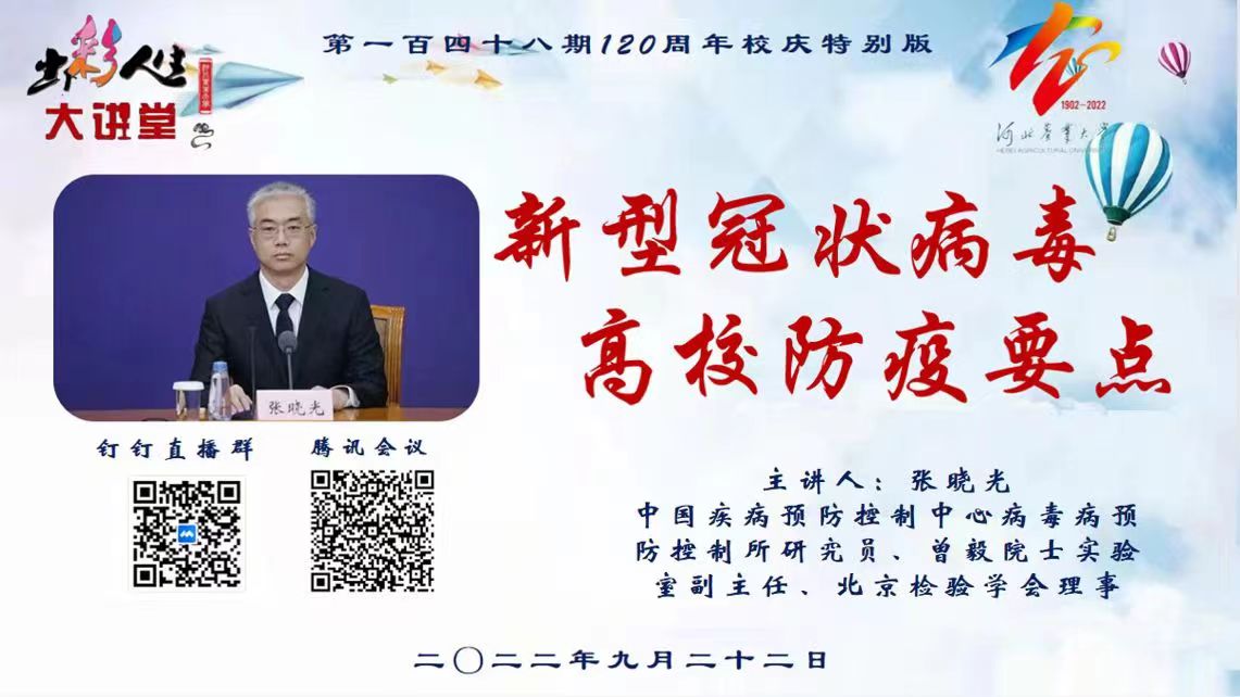 9月22日下午,由校团委主办、生命科学学院承办的第148期“出彩人生大讲堂”顺利举行,中国疾病预防控制中心病毒预防控制所研究员、曾毅院士实验室副主任、北京检验学会理事张晓光为全校师生做了题为“新型冠状病毒高校防疫要点”专题报告。报告会通过腾讯会议和钉钉直播同时进行,校团委书记乔孟涛、生命科学学院全体班子成员、各学院1000余名师生线上参会。