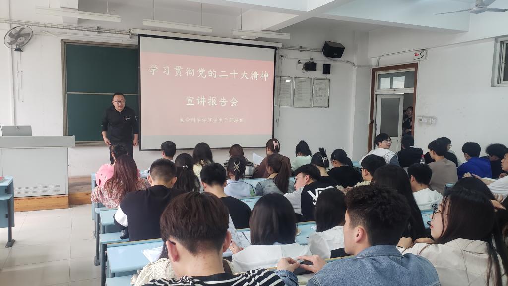 为深入学习宣传贯彻党的二十大精神,推进党的二十大精神真正入脑入心入行,鼓励学生争做有理想、敢担当、能吃苦、肯奋斗的新时代好青年。4月13日,生命科学学院在崇德楼教室举办了学生干部学习贯彻党的二十大精神专题培训会。本次活动邀请马克思主义学院郝飞飞老师进行宣讲,学院党委副书记陈靖主持活动并讲话,全体辅导员及170余名学生干部参加培训。