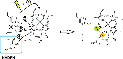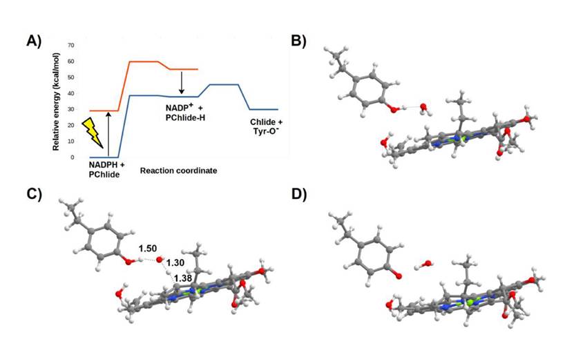 该文在LPOR蛋白三维晶体结构(2019,Nature 574,722-725)的基础上,进一步模拟和阐述了Pchlide底物分子与还原酶蛋白LPOR在光驱动下如何快速被催化成光合作用所必需的叶绿素分子的化学机理。简要来讲,该研究通过量子化学计算清楚地发现了一种具有极高的活化能的运转机制,该机制是从关键的Tyr189到基底的激发态电子转移开始的:这一过程显著增加了Tyr189的酸度,从而立即将其质子(通过中间的水分子)转移到基底C18。Tyr189处留下的电子空穴由严格保守的Cys222释放的电子填充,来自NADPH的氢化物同时转移,当多余的电子返回Cys222时,反应结束。这一机制似乎与现有的实验数据一致,并将最后的质子化步骤重新解释为质子转移到活性位点本身,目的是使其再生以进行新一轮催化。