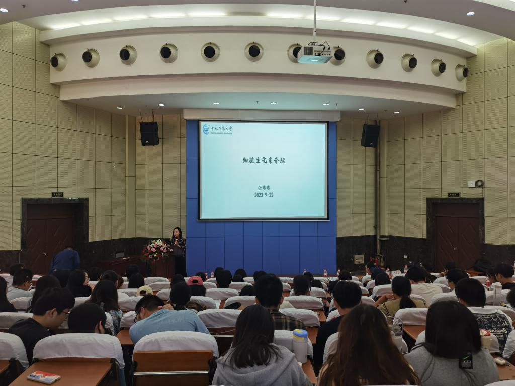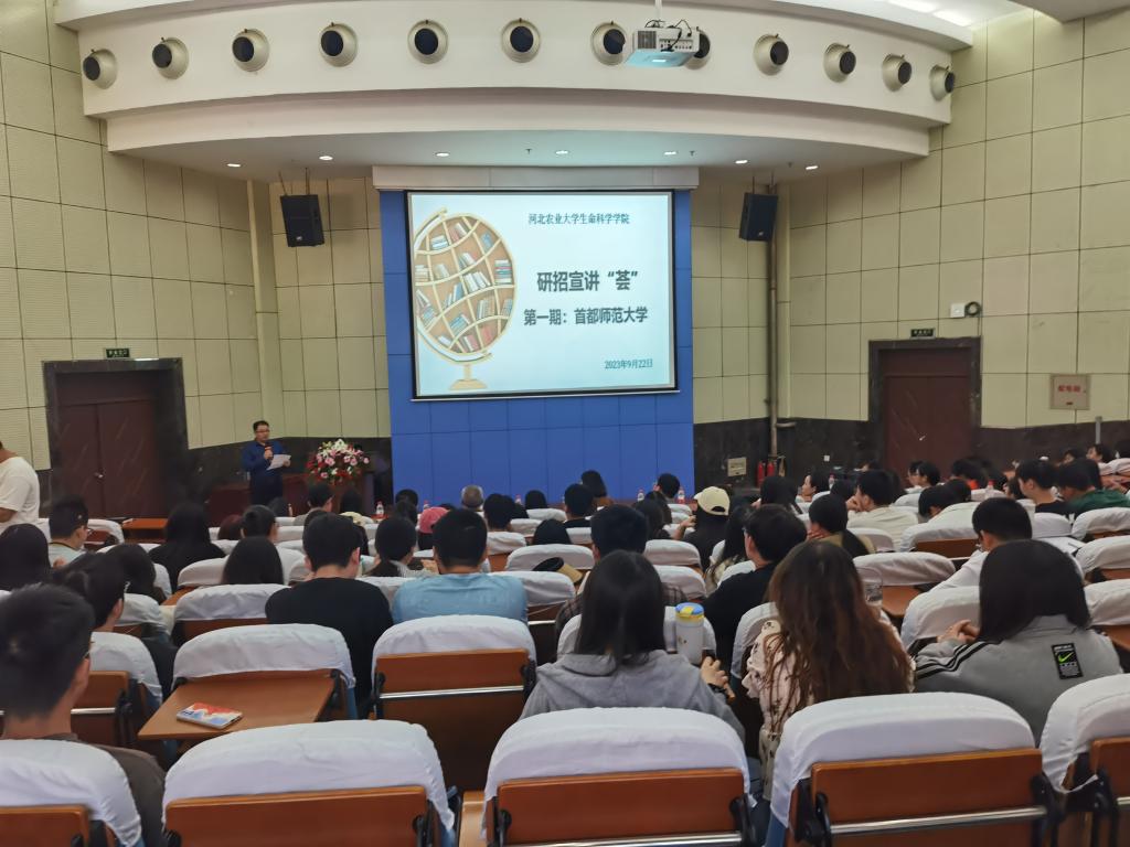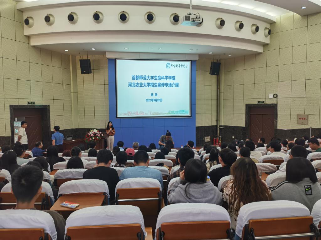 随后,学院邀请首都师范大学相关领导和教师面向三四年级学生进行考研招生宣讲,200余名学生现场聆听。首都师范大学生命科学学院副院长施慧介绍了学校学院基本概况、师资力量及学科专业特色、硕博士点设置情况等,对该院研究生招生录取情况进行详细解读,分析了相关专业就业前景。植物生物学系刘玉良教授、进化与生态学系孙成教授、细胞与生物化学系张玮玮教授分别对各系情况进行介绍,并且清晰阐述了各学科方向的导师队伍、科研实力、研究特色、研究成果和录取相关信息,对现场学生的相关咨询一一解答。